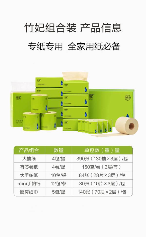 竹妃组合装 抽纸:4包+卷纸:4卷+厨房用纸:5包