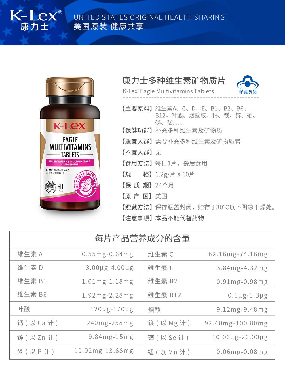 康力士多种维生素多种矿物质60片 含16种营养素钙片
